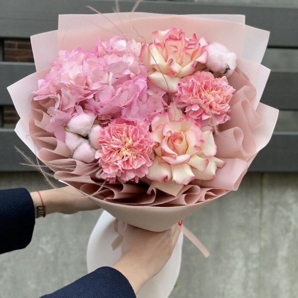 Гортензия - 1 шт. розы - 1 шт. Гвоздика - 2 шт.