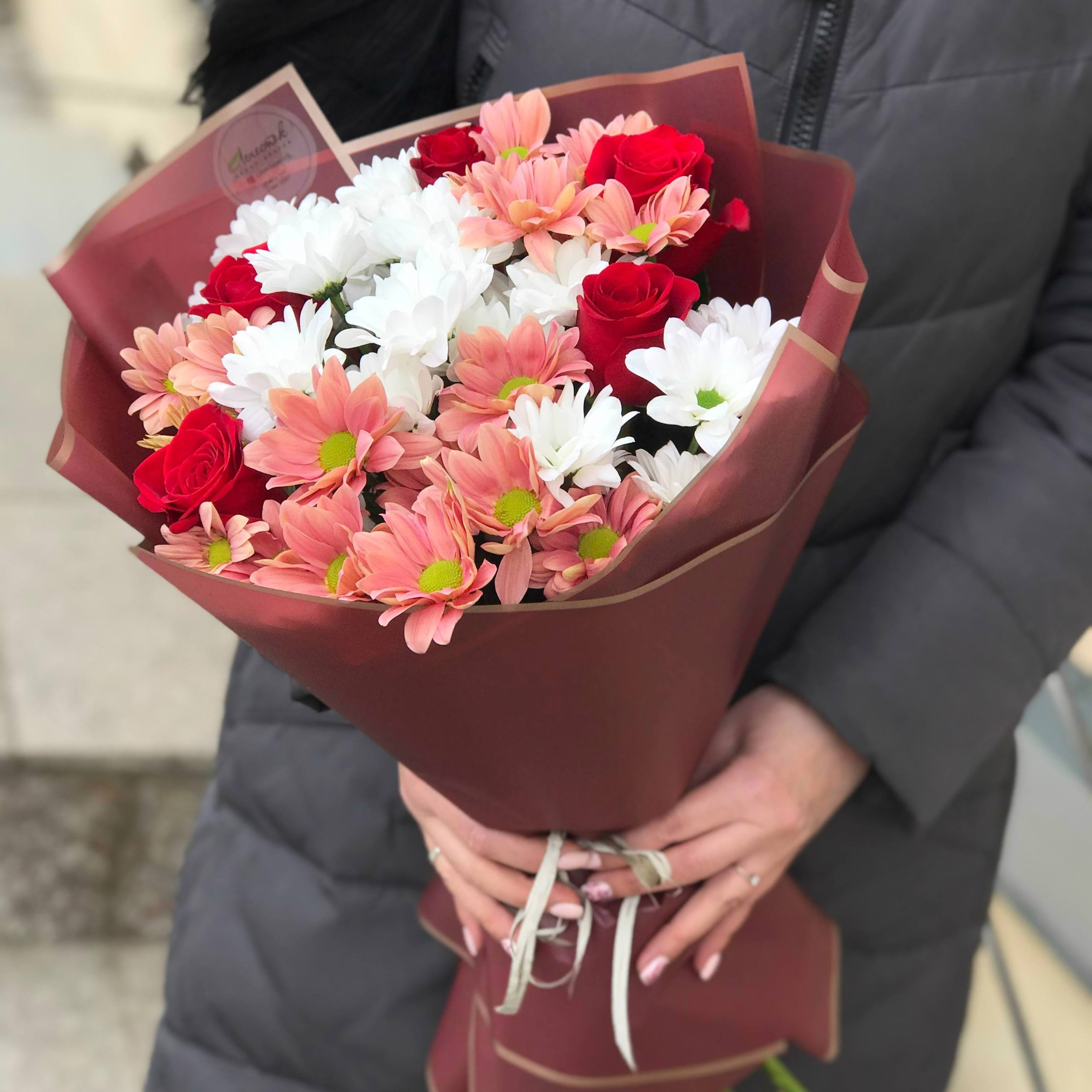 Букет из персиковых хризантем и красных роз в Спас-Клепиках