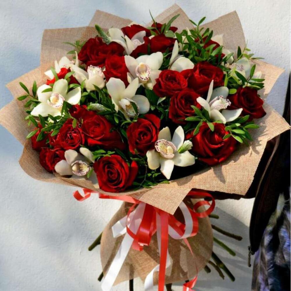 Стильный и яркий букет из красных Роз, Орхидеи и Фисташки доступен к заказу в нашем интернет-магазине!Цвета в ассортименте.(При желании возможно заменить)!Наличие определённого цвета уточняйте перед заказом!ВНИМАНИЕ! НА ФОТО ОБРАЗЕЦ!В любой букет, дополнительно, можно добавить и другую зелень. Большой ассортимент!(Пожелание пишите нам в чат)❗️Обратите внимание❗️Другая подарочная упаковка, открытки, топперы, вазы и другие праздничные аксессуары доступны в доп.товарах!✅ Наш интернет-магазин на рынке уже более 8 лет!✅ Свежие цветы 3 раза в неделю!✅ Быстрая доставка в день заказа!