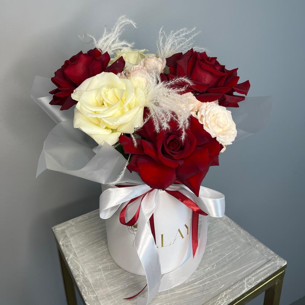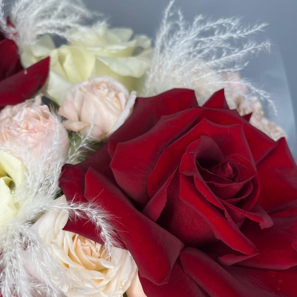 Лента - 2 шт. Роза Эксплорер - 3 шт. Роза Мондиаль - 2 шт. сухоцвет «пушистая пампасная трава» - 3 шт. коробка шляпная «alay. flowers» - 1 шт.