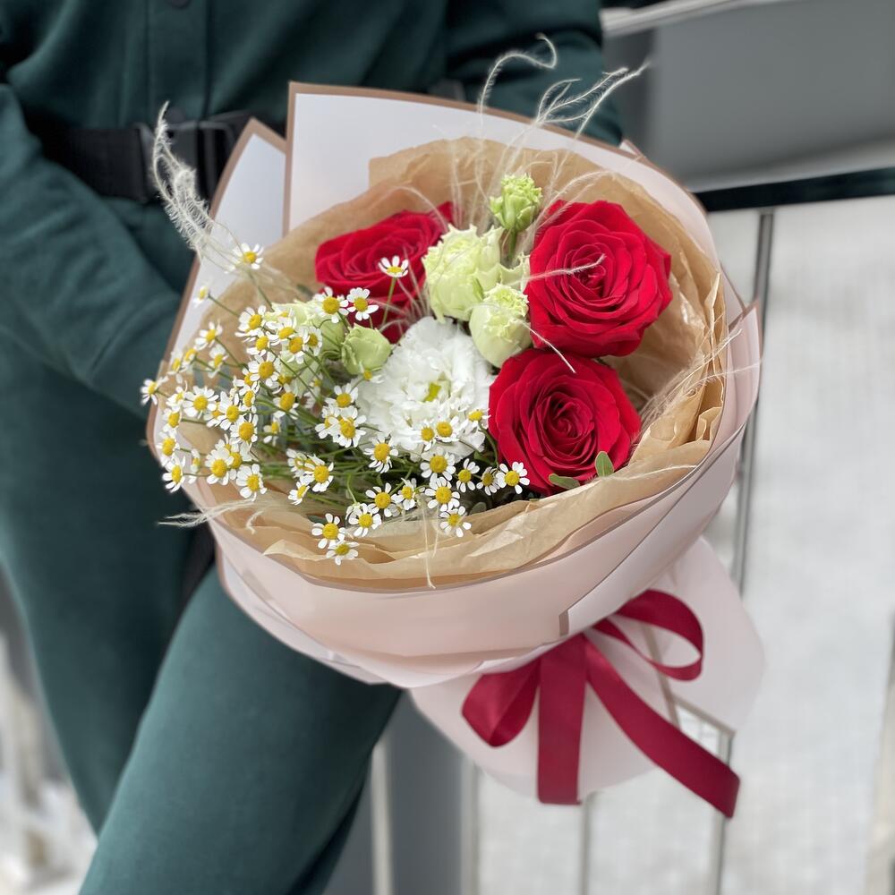Букет Жаннет из роз, стифы, ромашек и эустомы в Спас-Клепиках